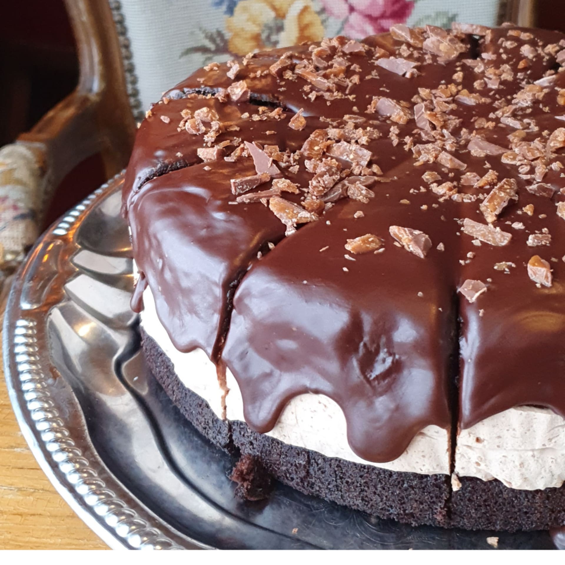 Minttukrokantti, suklaaganache, koristeena suklaarouhe,